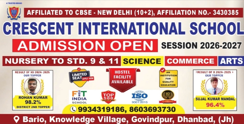 गोविंदपुर, धनबाद: गोविंदपुर स्थित प्रतिष्ठित शैक्षणिक संस्थान क्रिसेंट इंटरनेशनल स्कूल में 77वाँ गणतंत्र दिवस देशभक्ति और हर्षोल्लास के साथ मनाया गया। यह अवसर विद्यालय के लिए दोगुने उत्साह का रहा, क्योंकि इसी दिन ‘क्रिसेंट ओलंपिक सप्ताह’ का भी भव्य समापन हुआ। खेल, शिक्षा और संस्कृति के इस अनूठे संगम ने उपस्थित सभी लोगों को मंत्रमुग्ध कर दिया।